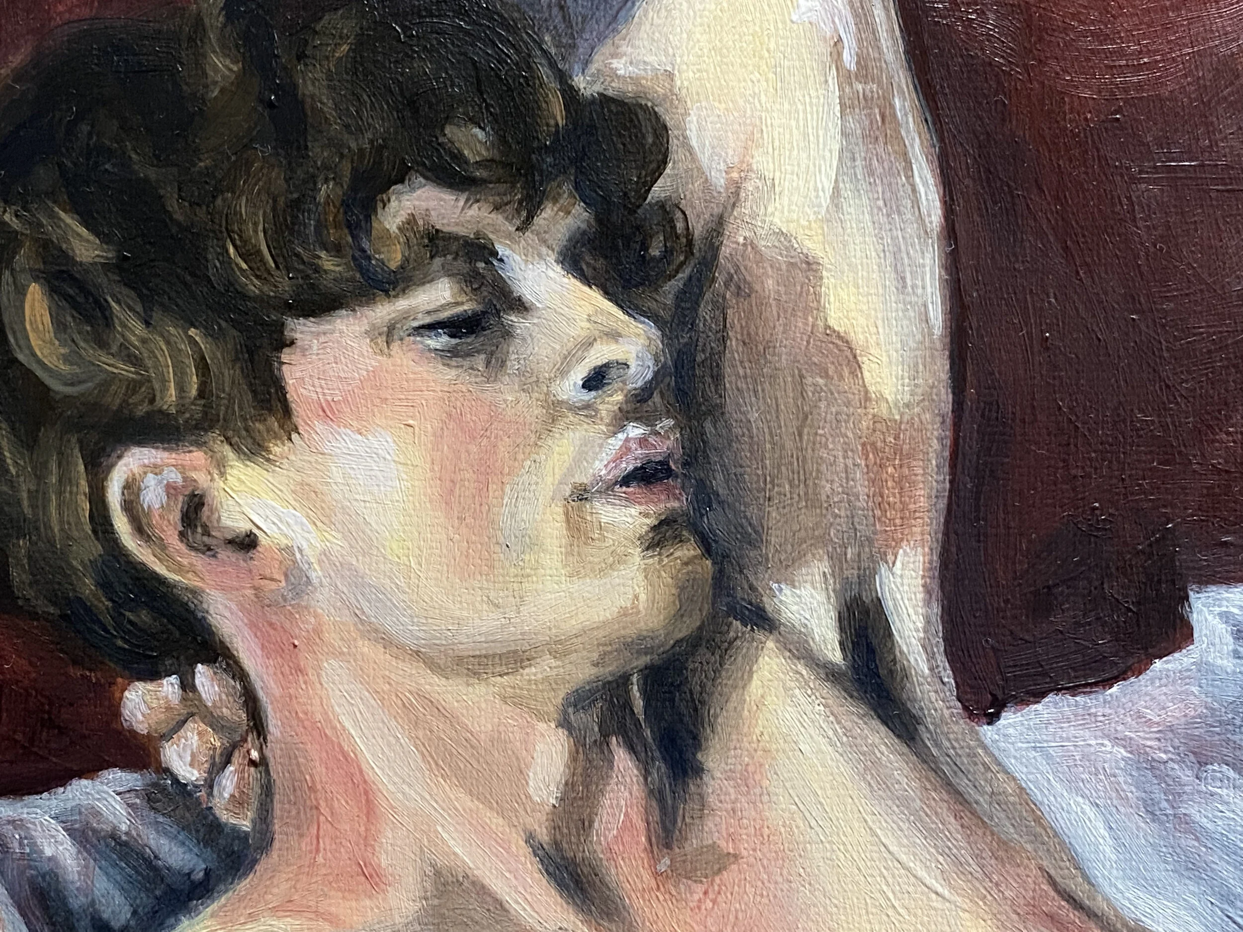 An oil painting on canvas paper of model Ronan in the manner of an odalisque.