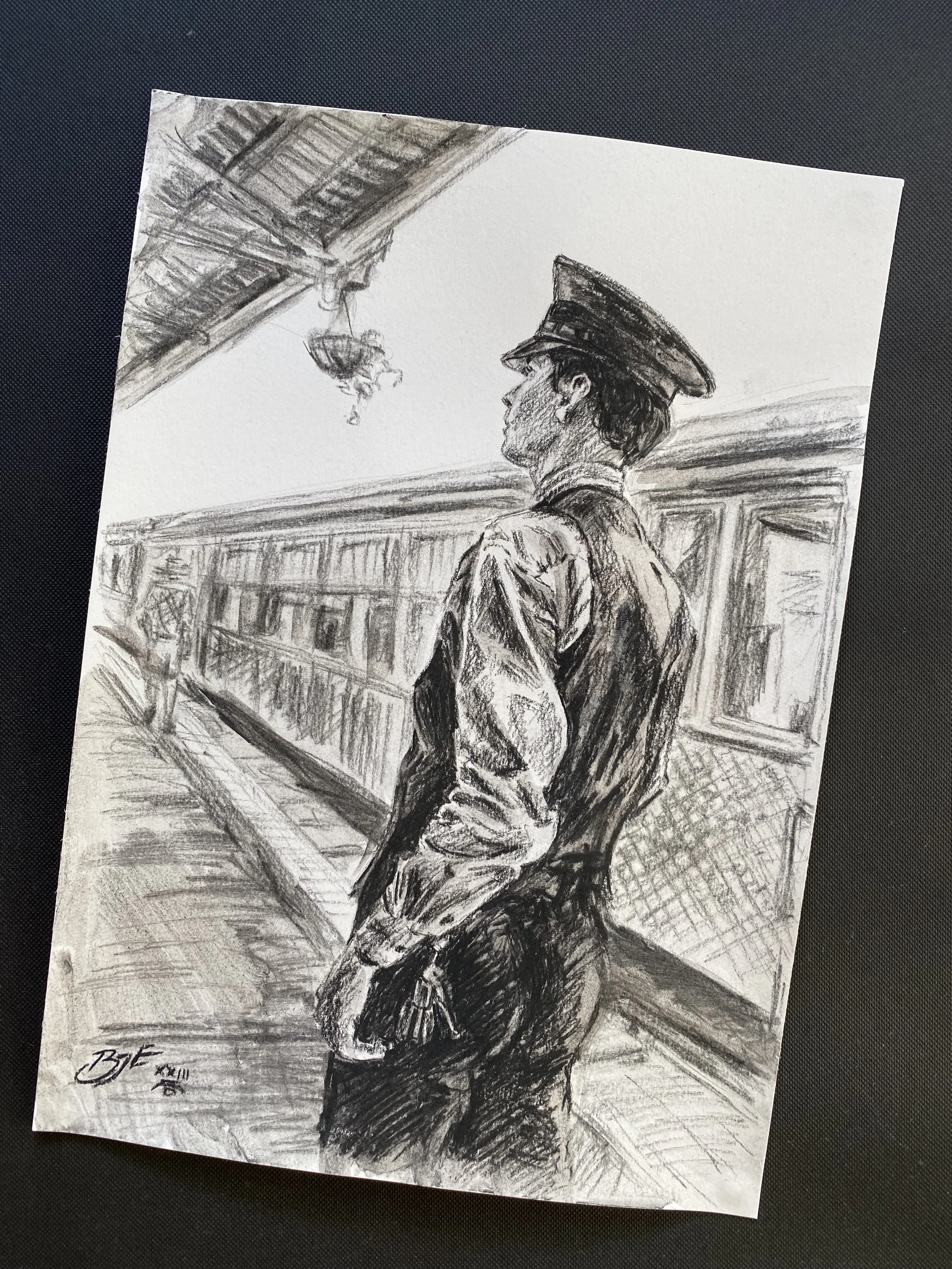 A charcoal drawing of George, a volunteer guard on the Mary Valley Rattler heritage railway line in Australia.